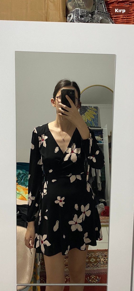 Siyah midi elbise, V yaka ve uzun kolludur. İpeksi kumaştan yapılmış, transparan detaylı ve çiçekli batik desenlidir. Rahat sokak stili için uygundur.Toplamda 2 kere giymişimdir tertemiz yenidir .