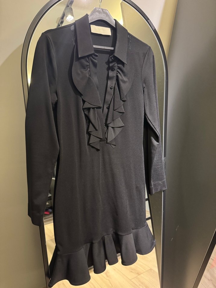 Uzun kollu, yakalı ve ön ile etek kısmında fırfır detaylı siyah midi elbise. Gotik ve Paris tarzını yansıtan şık bir model. 1 kez giydim. Kusuru yok.