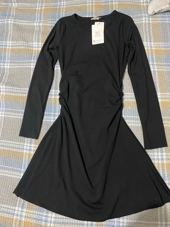 Siyah midi elbise, uzun kollu ve yuvarlak yaka detayına sahiptir. Bel kısmında drapeli ve vücuda oturan kesimiyle ofis kullanıma uygundur.