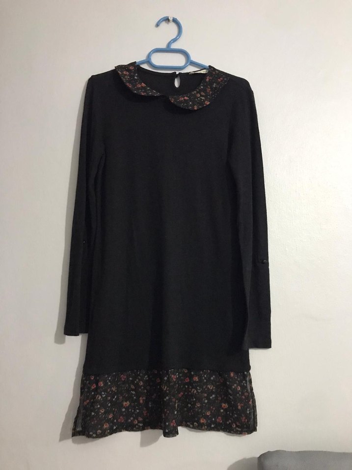 Uzun kollu, bol kesim siyah midi elbise, çiçek desenli fırfırlı yakası ve eteğiyle, yumuşak sentetik kumaştan üretilmiştir.
