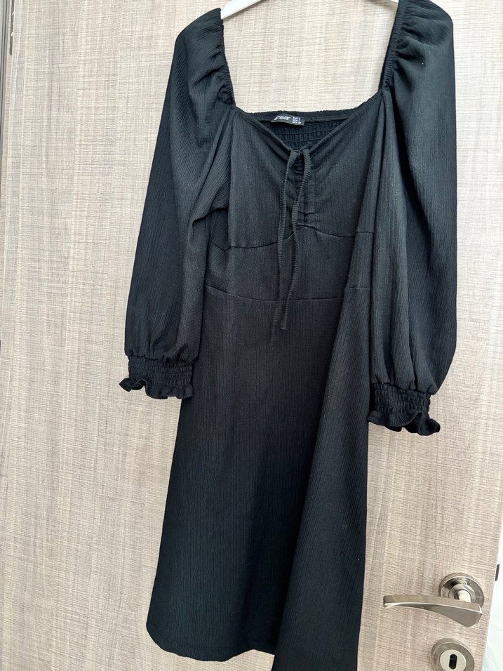 Siyah midi elbise, uzun kollu ve tekne yaka ile pilili detaylara sahiptir. Rahat kesimli ve nefes alabilen keten kumaştan yapılmıştır, gündelik kullanım için uygundur.