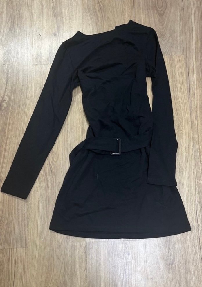 Bu siyah midi elbise, uzun kollu, boğazlı ve kemerli olup, yumuşak sentetik kumaştan yapılmıştır.