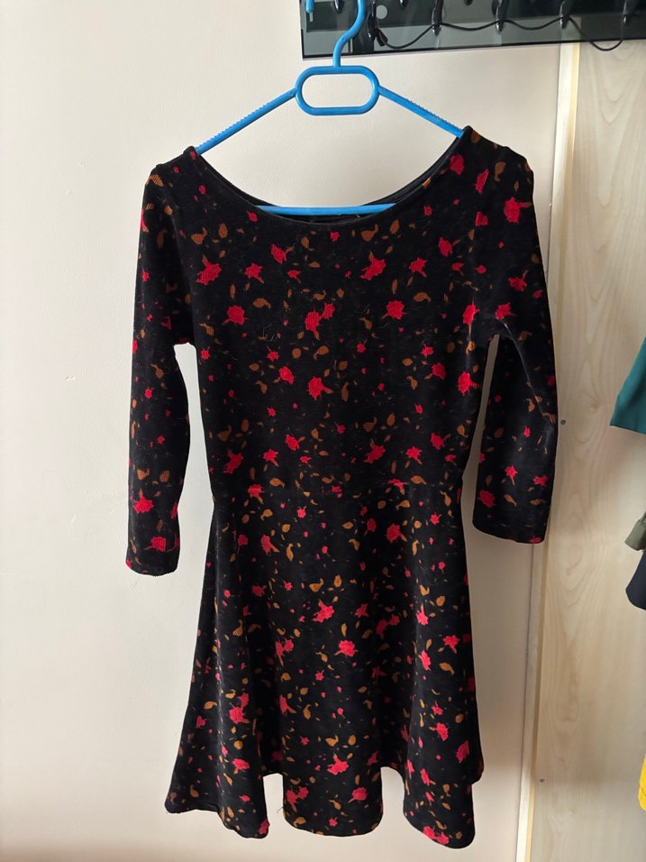 Uzun kollu, boyu 85 beli 33 cm kadife v yakalı ve drapeli kesime sahip siyah midi elbise. Yumuşak kumaşta koyu çiçek desenlidir, romantik akşamlar için uygundur.