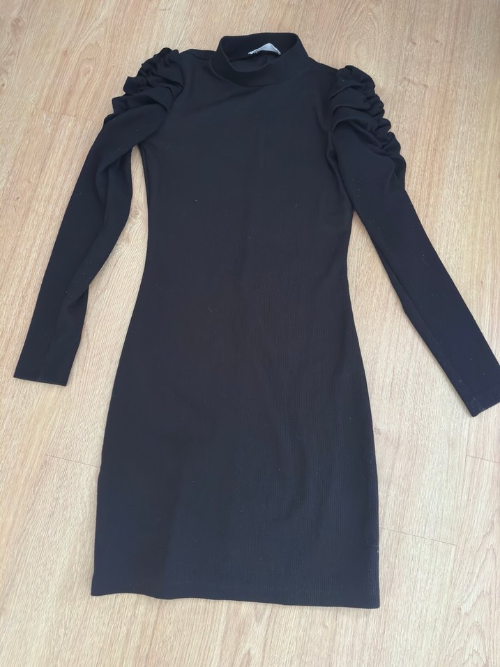 Uzun kollu ve fırfır detaylı siyah midi elbise, yüksek yakalı ve vücuda oturan kesimiyle günlük kullanıma uygundur.