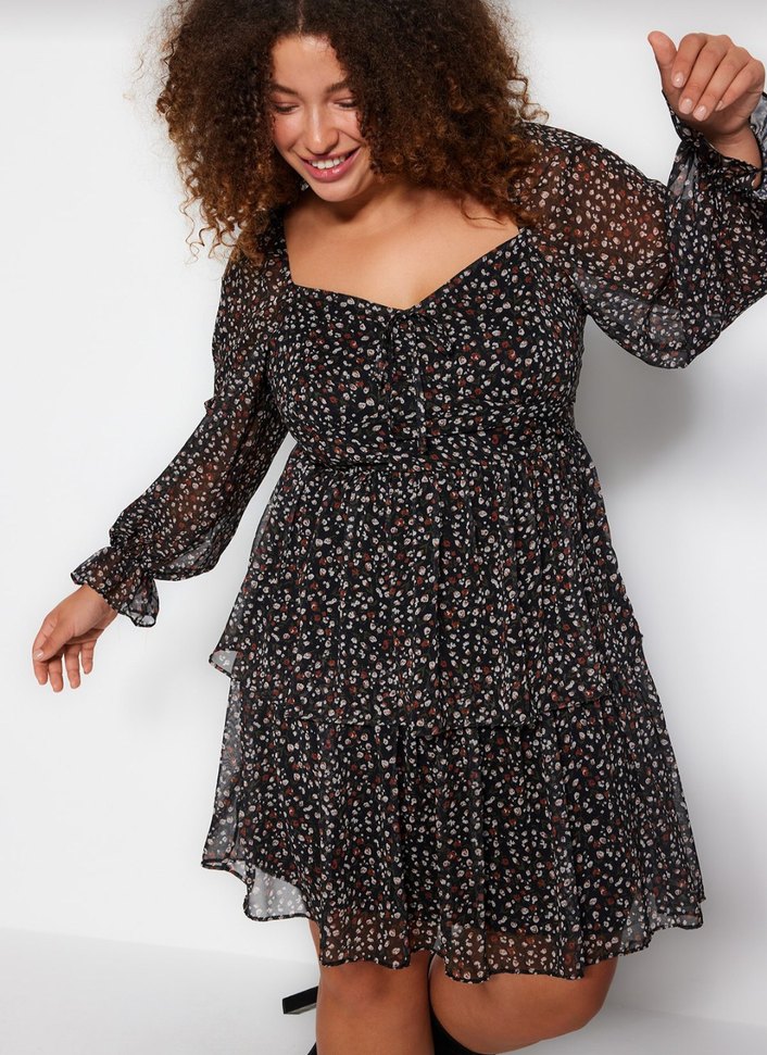 Uzun kollu, V yakalı siyah midi elbise, bol kesim ve fırfır detaylıdır. Koyu tie-dye desenli, yumuşak sentetik kumaştan yapılmıştır.