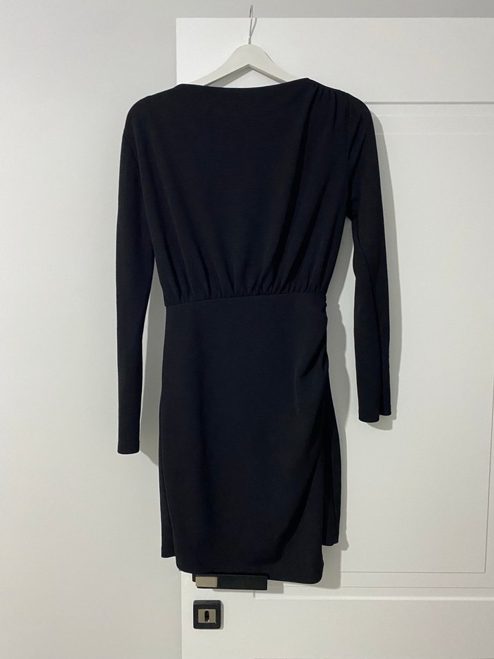 Trendyol marka s beden ..Bu siyah midi elbise, V yaka ve uzun kollu drapeli tasarımıyla ofis için uygundur. Minimalist ve çağdaş şıklık sunar.