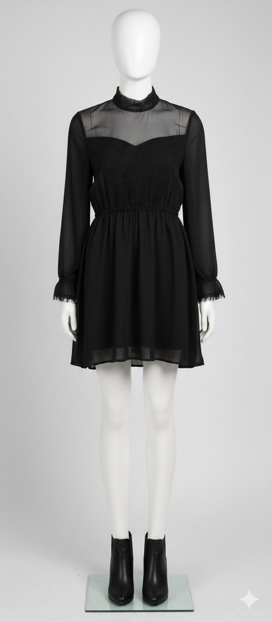 Uzun kollu, yüksek yakalı siyah midi elbise. Fırfır detaylı, hafif şeffaf üst kısmı ve bol kesimiyle romantik akşamlar için ideal.