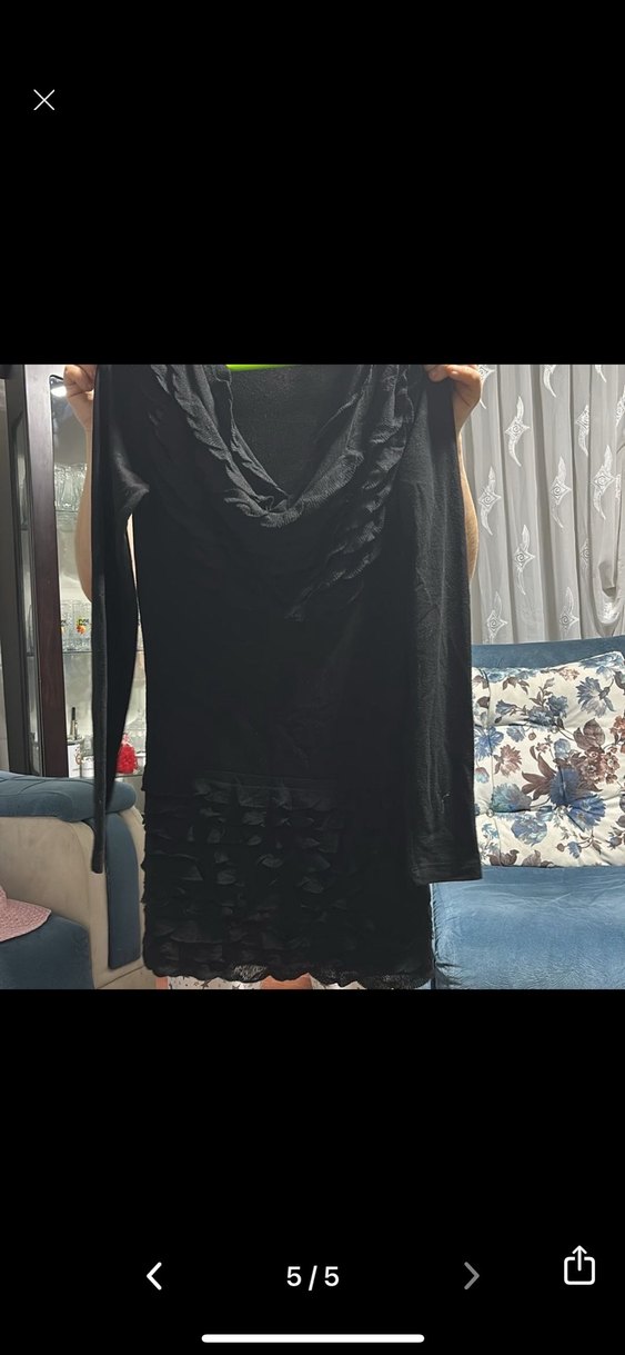 Siyah, uzun kollu, V yakalı midi elbise, katmanlı fırfır detaylarıyla gotik tarzı yansıtıyor.