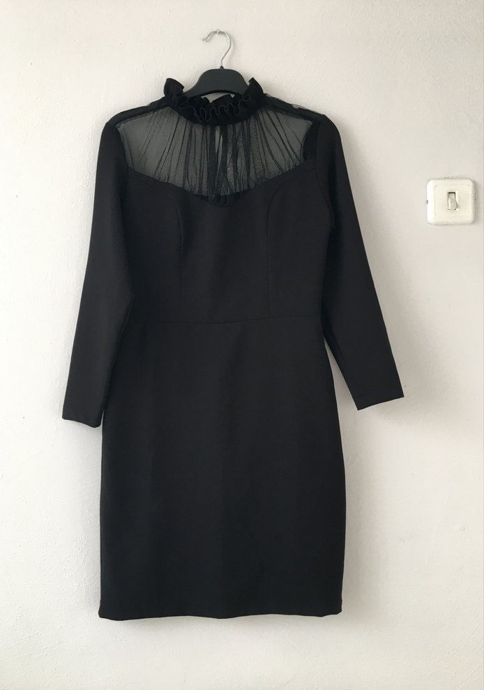 Uzun kollu, yüksek yakalı ve fırfırlı siyah midi elbise. Transparan üst kısmı gotik tarzı yansıtıyor, şık ve modern bir görünüm sağlar.