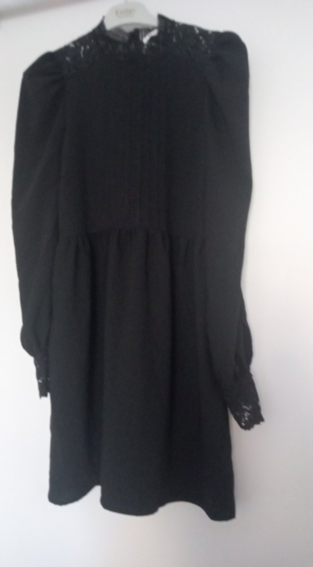 Yüksek yakalı, uzun kollu ve dantel manşetli siyah midi elbise, bol kesim ve fırfır detaylıdır. Ofis kullanımı için uygundur.