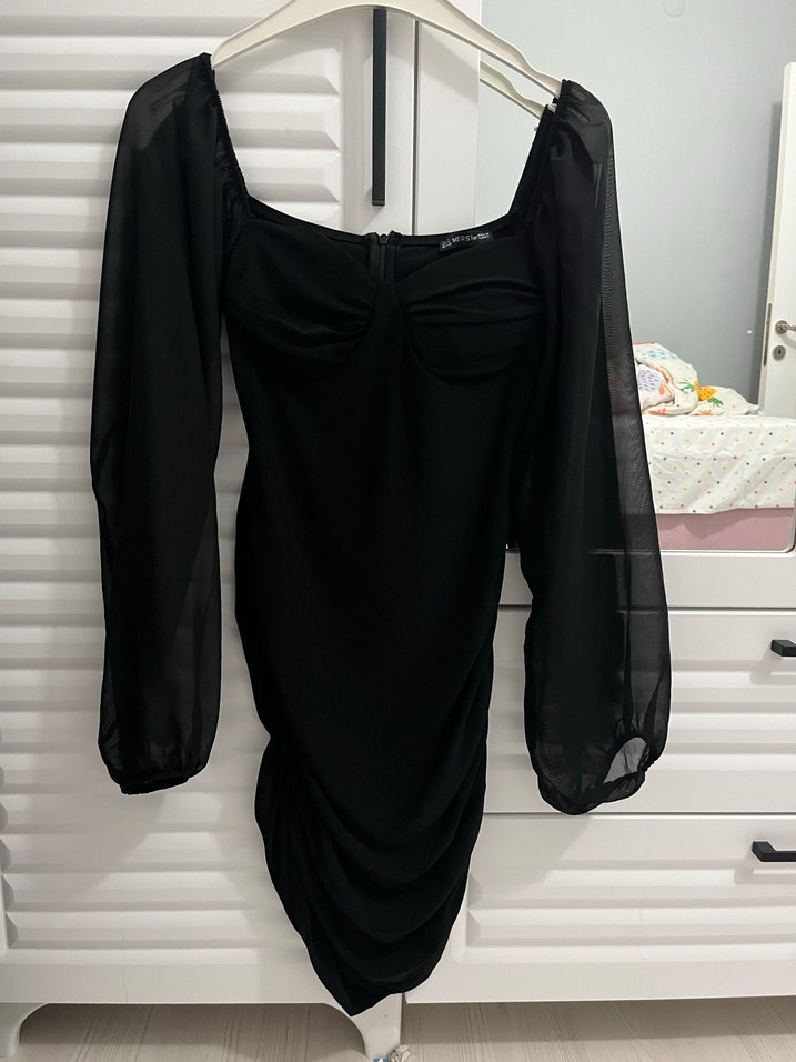 Uzun şeffaf kollu, drapeli V yaka, baskılı siyah midi elbise. Cesur tarz için uygundur, romantik akşamlar için ideal.