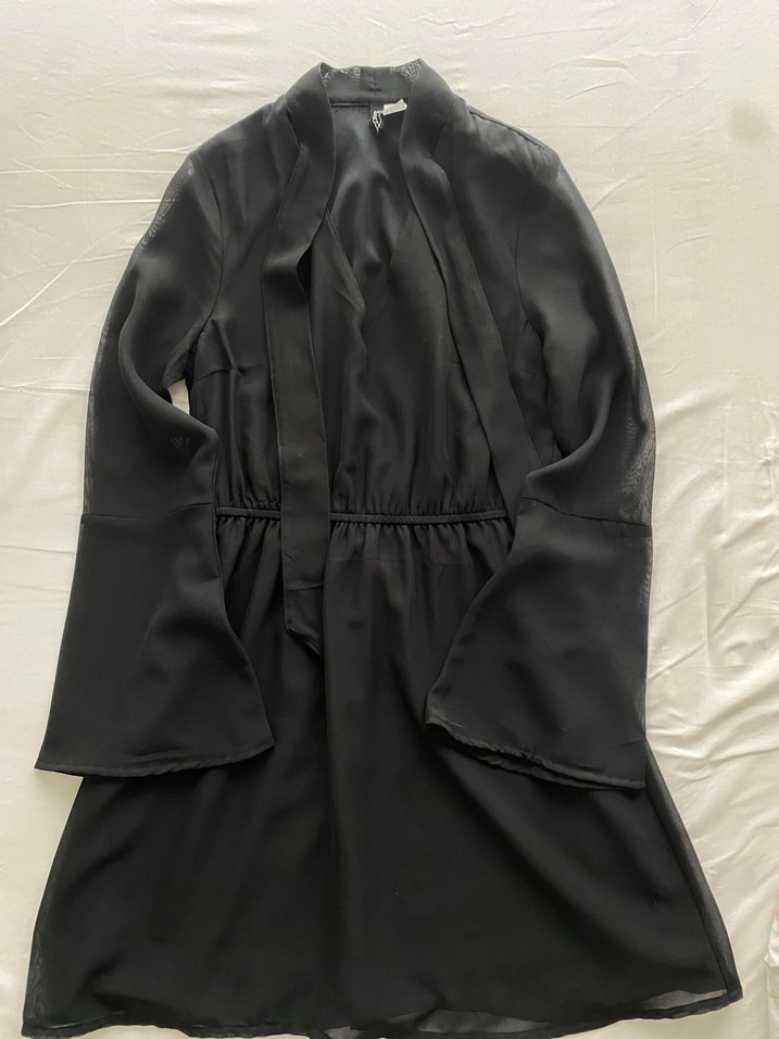 Siyah midi uzun kollu elbise, V yakalı, bol kesim ve drapeli tasarıma sahiptir. Gotik tarzda, ofis kullanımı için uygundur.