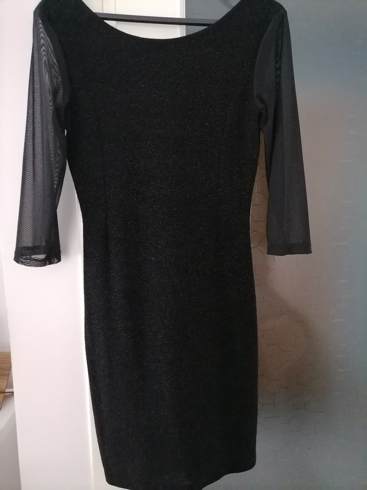 Uzun tül kollu, drapeli V yakalı, dar kesim siyah midi elbise, gotik tarzda ofis için uygun.