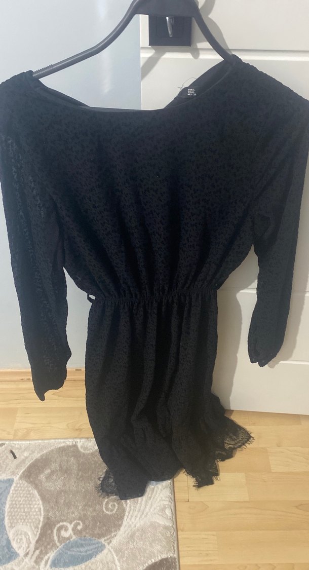 Uzun kollu, V yakalı, fırfırlı siyah midi elbise. Yumuşak sentetik kumaştan, gotik ve romantik tarzlara uygun.