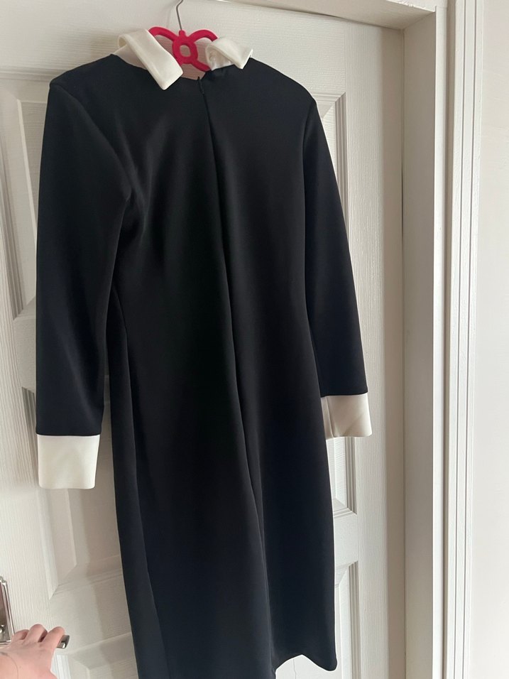 Siyah elbıse, beyaz manşetli yakalı ve drapeli tasarıma sahiptir. Ofis için uygun, uzun kollu
