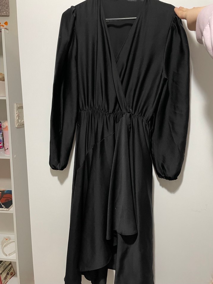 Siyah midi elbise, uzun kollu ve V yaka tasarıma sahiptir. İpek gibi kumaştan yapılmış, dökümlü ve rahat kesimlidir. Ofis için uygundur, gotik tarzda.