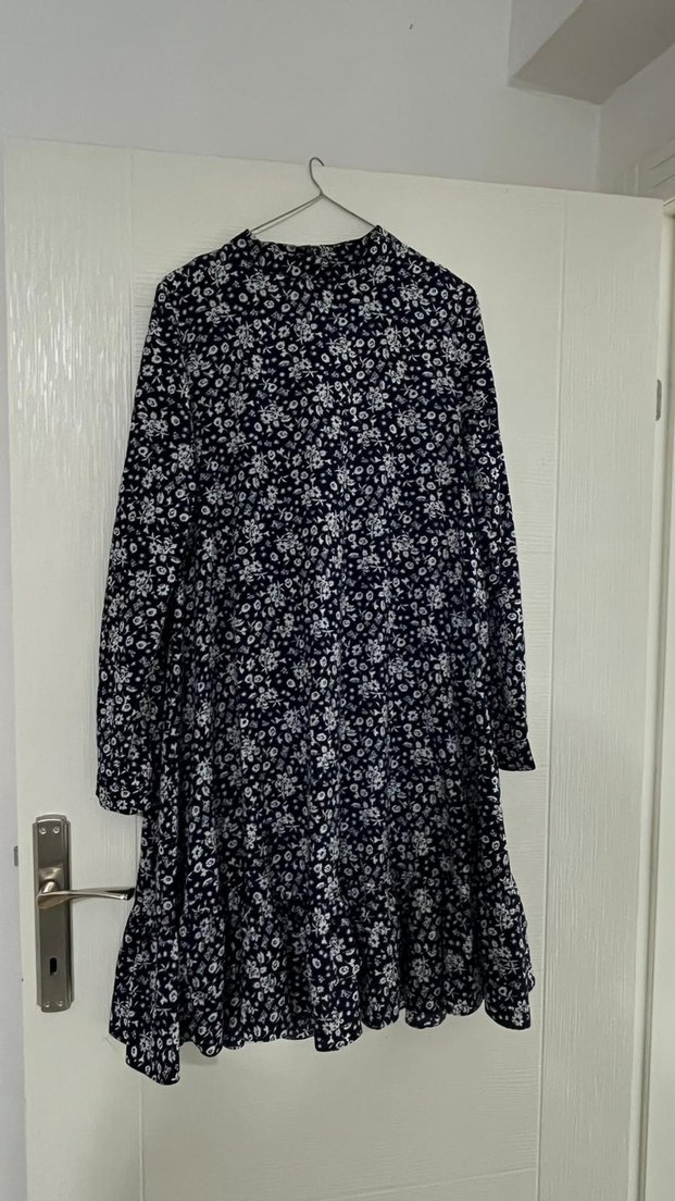 Siyah midi elbise, uzun kollu ve yüksek yakalıdır. Bol kesim ve fırfır detaylara sahiptir. Koyu tonlarda batik deseni ve yumuşak sentetik kumaştan üretilmiştir. Bohem ve retro tarzda günlük kullanıma uygundur. 38 beden kolu mansetli sırtı düğme ve fermuarlı