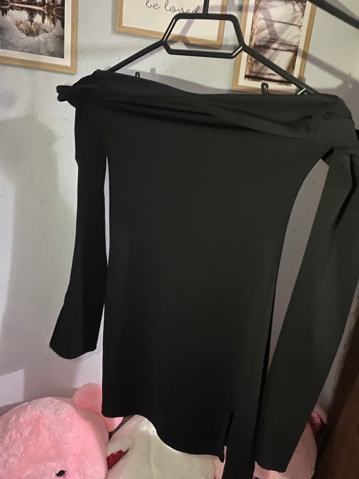 Uzun kollu, drapeli, straplez siyah midi elbise, gotik tarzda şık ve vücuda oturan kesime sahiptir.