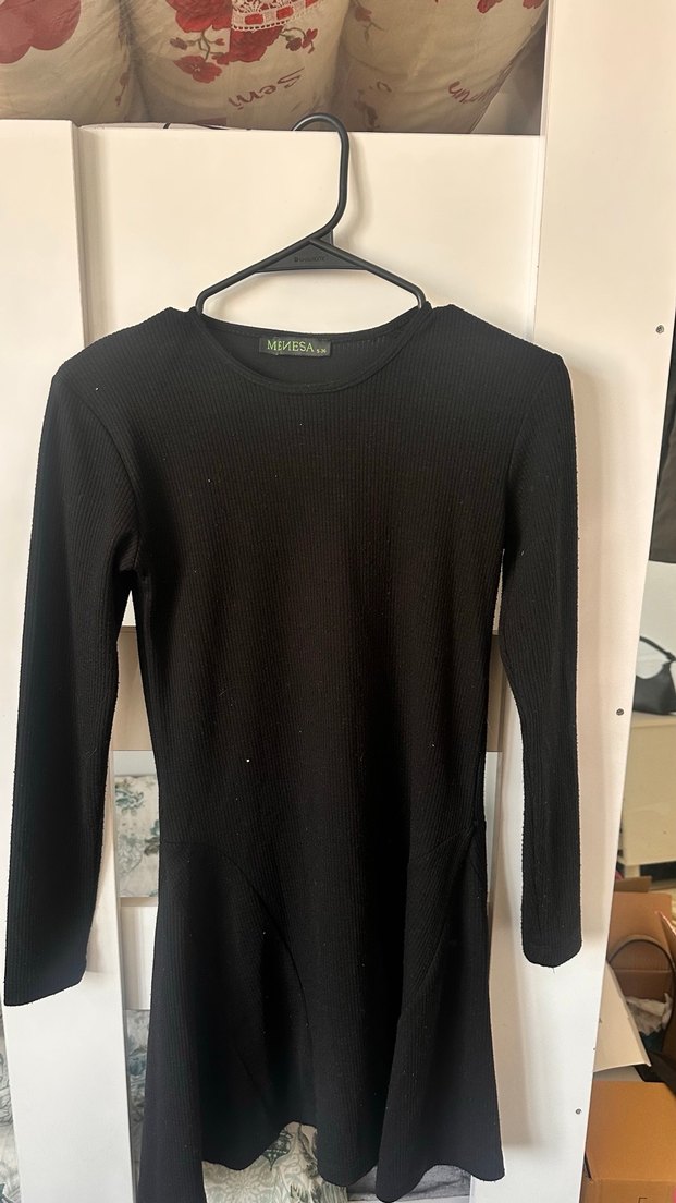 Uzun kollu, bisiklet yaka, siyah midi triko elbise. Keten kumaştan, minimalist gotik tarzıyla günlük kullanıma uygun.