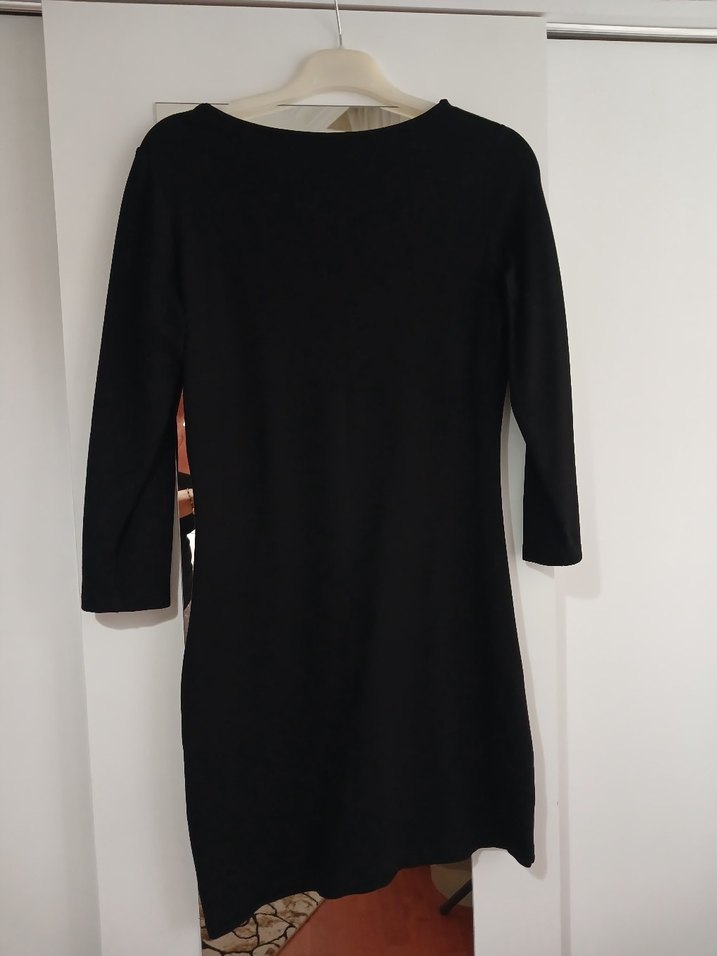 Siyah, uzun kollu ve bisiklet yaka, drapeli detaylı, yumuşak sentetik kumaştan yapılmış dar kesim midi triko elbise. Minimalist gotik tarzda, romantik akşamlar için uygun.