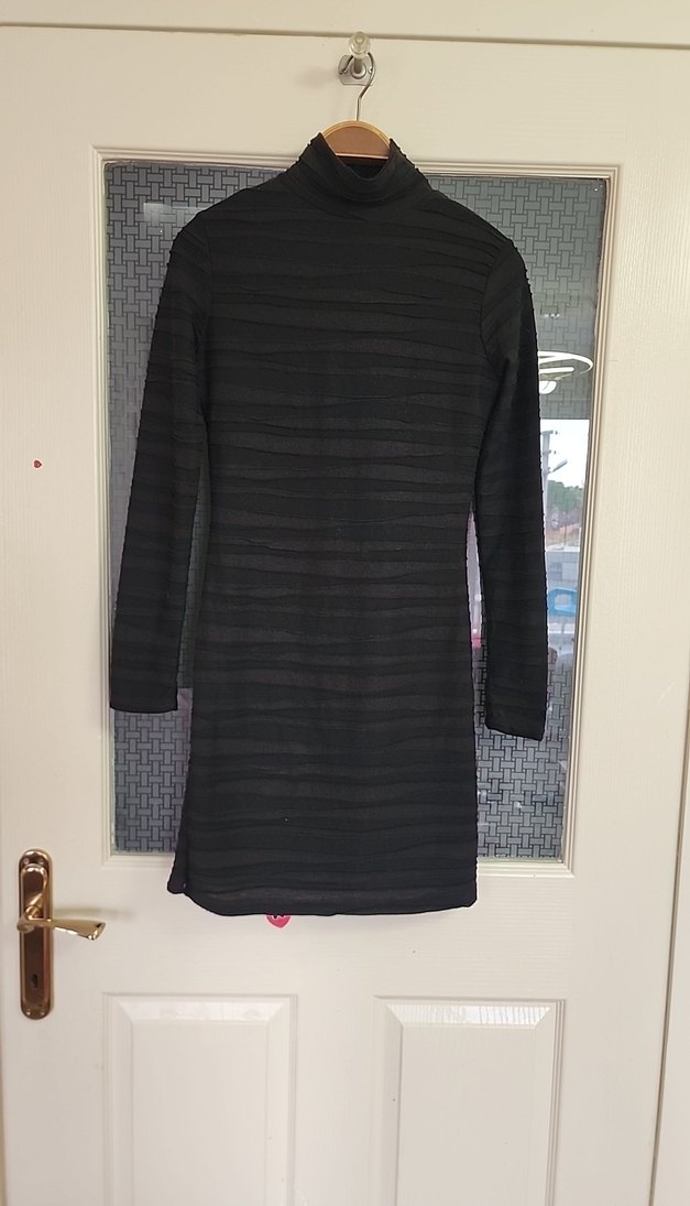 Dar kesim siyah triko elbise, uzun kollu ve yüksek yakalıdır. Pilili detayları ve midi boyuyla minimalist gotik tarzı yansıtır. boy93 cm iki kol arasi 43 cm