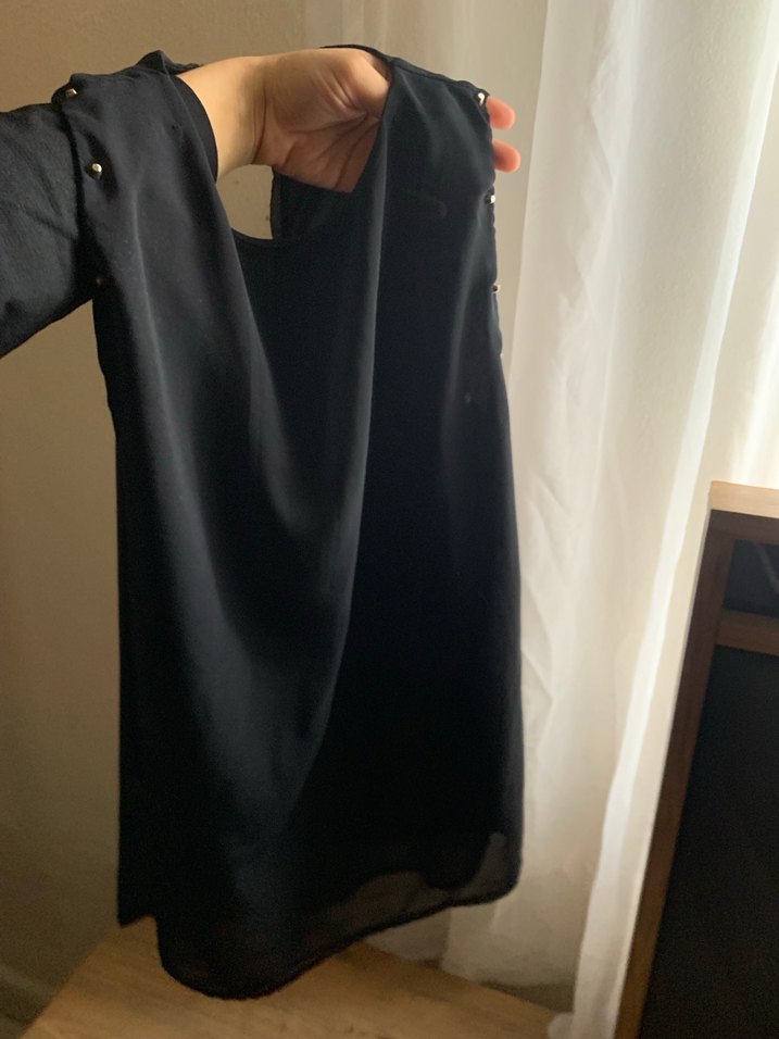 Siyah midi tunik, yüksek yakalı ve uzun kollu, dökümlü ve bol kesimdir. İpek gibi kumaştan, minimalist gotik stile uygundur.