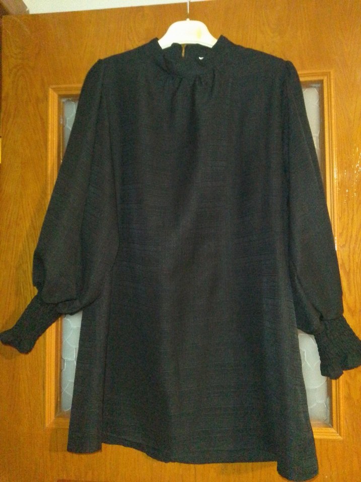 Yüksek yakalı, uzun kollu ve drapeli siyah midi tunik. Keten kumaştan, bol kesim ve ofis için uygun gotik tarzda. 38 bedendir 40 bedene de uygundur salaş bir model oturtturma sadece bir kez kullanıldı hiçbir defa mı yoktur yeniden farksızdır