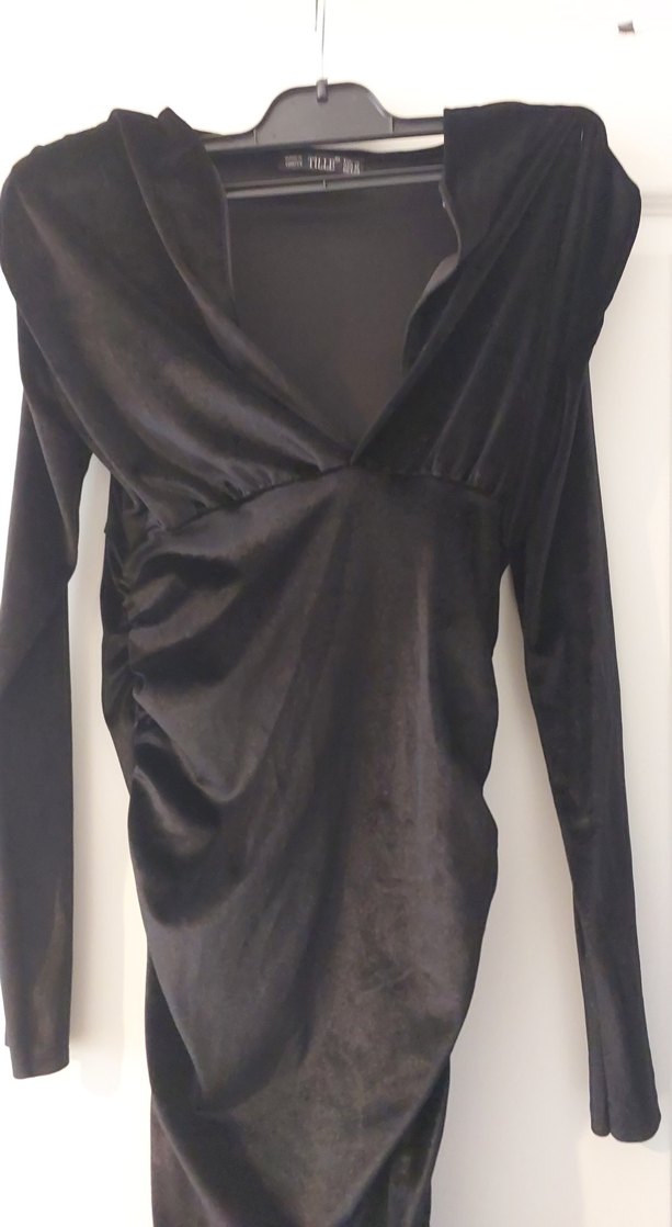 Uzun kollu, v yaka ve drapeli siyah midi elbise, gotik tarzıyla romantik buluşmalar için uygun. Siyah kadife, omzu vatkalı, yanları drapeli sadece 1 kez giyildi. Tertemiz.