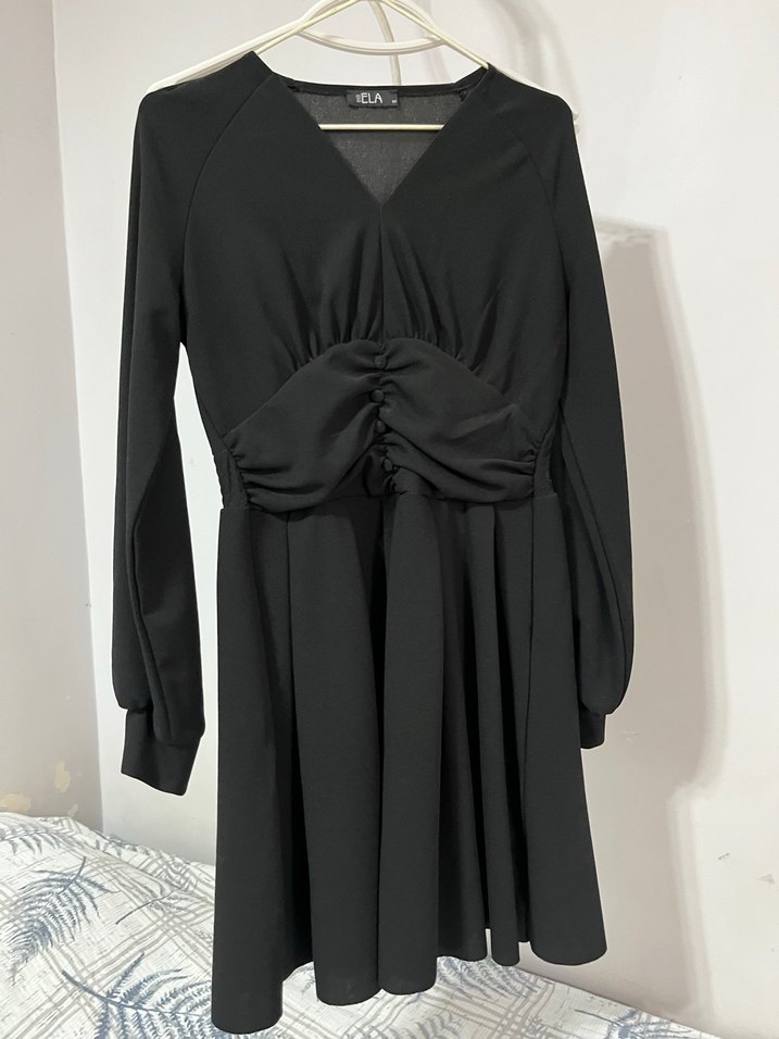 Dar kesim siyah midi elbise, uzun kollu ve V yakalıdır. Bel kısmında drapeli detay bulunur. Minimalist, şık ve ofis için uygundur.