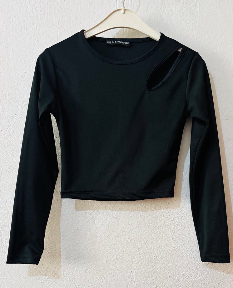 Uzun kollu, bisiklet yakalı ve omuzda yırtmaç detayı bulunan siyah, dar kesim mini bluz. Pürüzsüz sentetik kumaştan, günlük ve sokak stili için uygun.