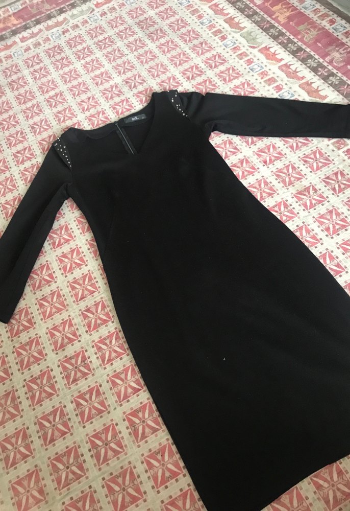 Siyah, uzun kollu, V yakalı, fermuarlı ve zarif taşlı detaylara sahip elbise m bedene kadar olur