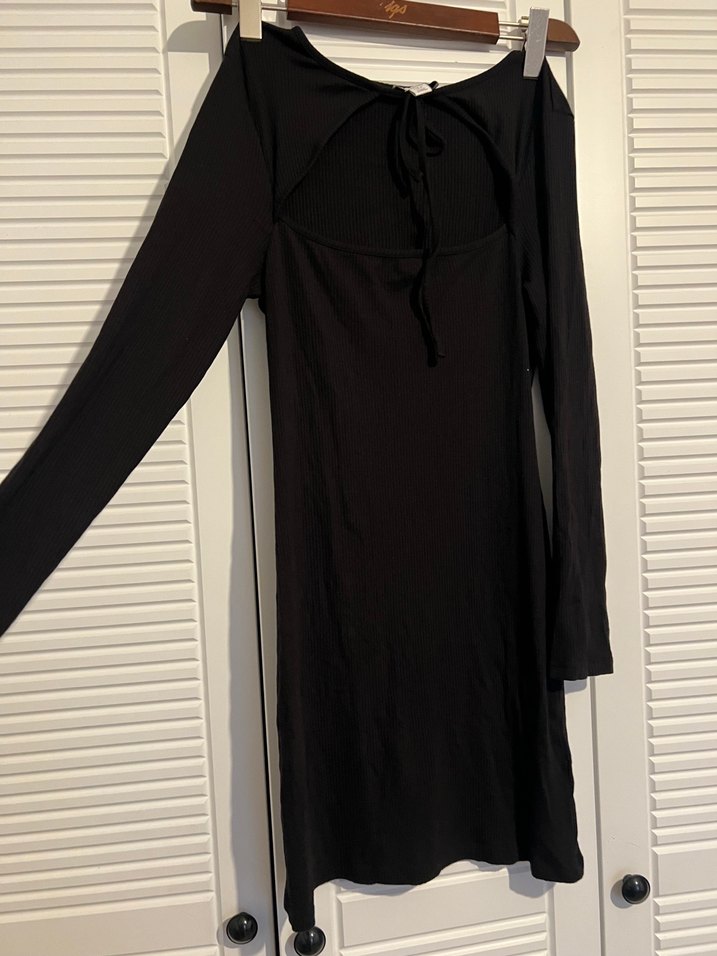 Uzun kollu, drapeli kayık yaka, siyah mini elbise. Yumuşak sentetik kumaştan, cesur tarz için uygundur.