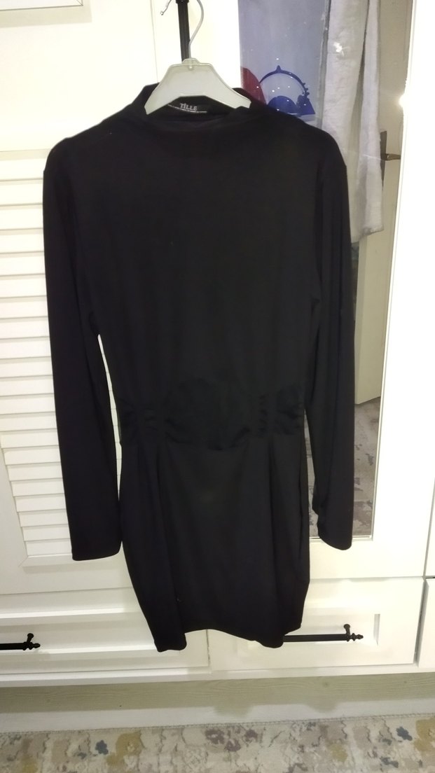Uzun kollu, yüksek yakalı siyah mini elbise. Minimalist tarzda, drapeli detaylı ve ofis kullanımı için uygun. beli tül detaylı sadece bir kez kullanıldı