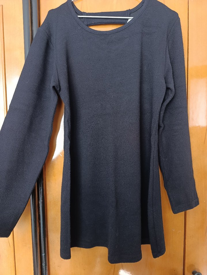 Yuvarlak yaka ve uzun kollu, kışlık yumuşak kumaşa sahip,sırt detaylı, boyu diz üstünde elbise