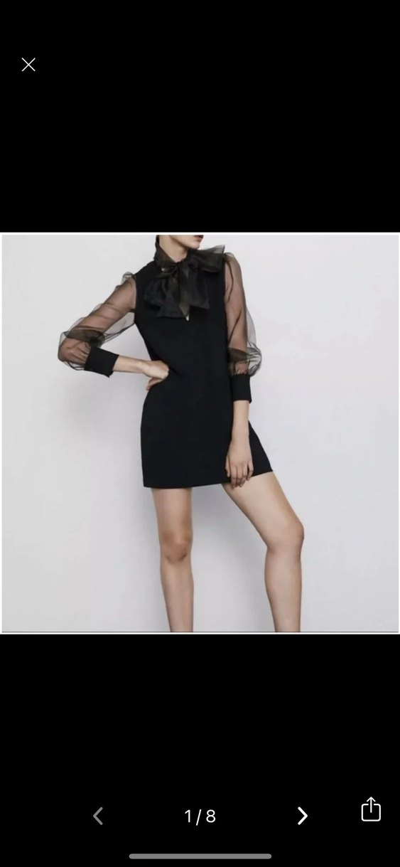 Uzun transparan kollu, straplez yakalı ve fiyonk detaylı, sentetik kumaştan yapılmış siyah mini elbise. Gotik ve avangart tarzlara uygundur.