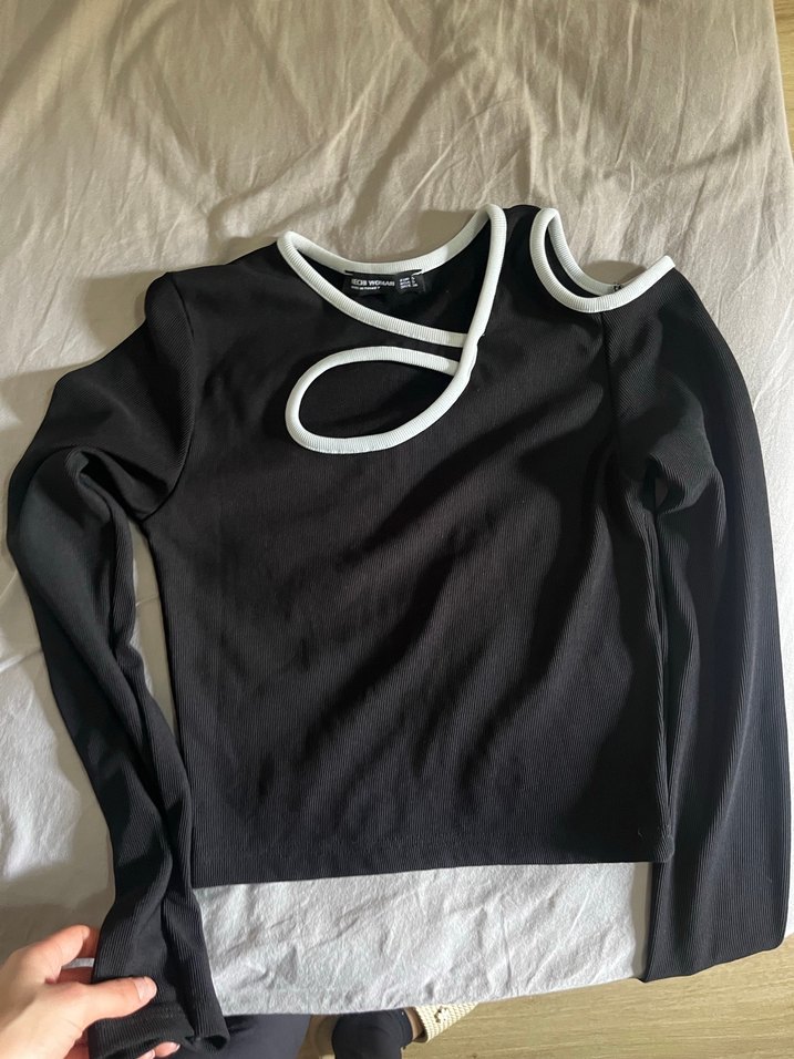 Uzun kollu, siyah ve beyaz detaylı, minimal gotik tarzda, yırtmaçlı dar kesim bluz. Günlük kullanıma uygundur.