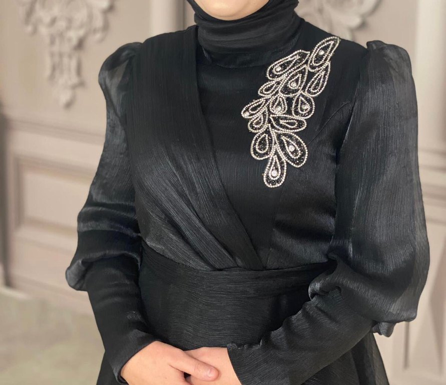Uzun kollu, yüksek yakalı siyah abiye elbise, parlak kumaş ve nakış detaylarına sahiptir. Dökümlü tasarımı ve klasik kesimiyle düğünler için uygundur. ✨