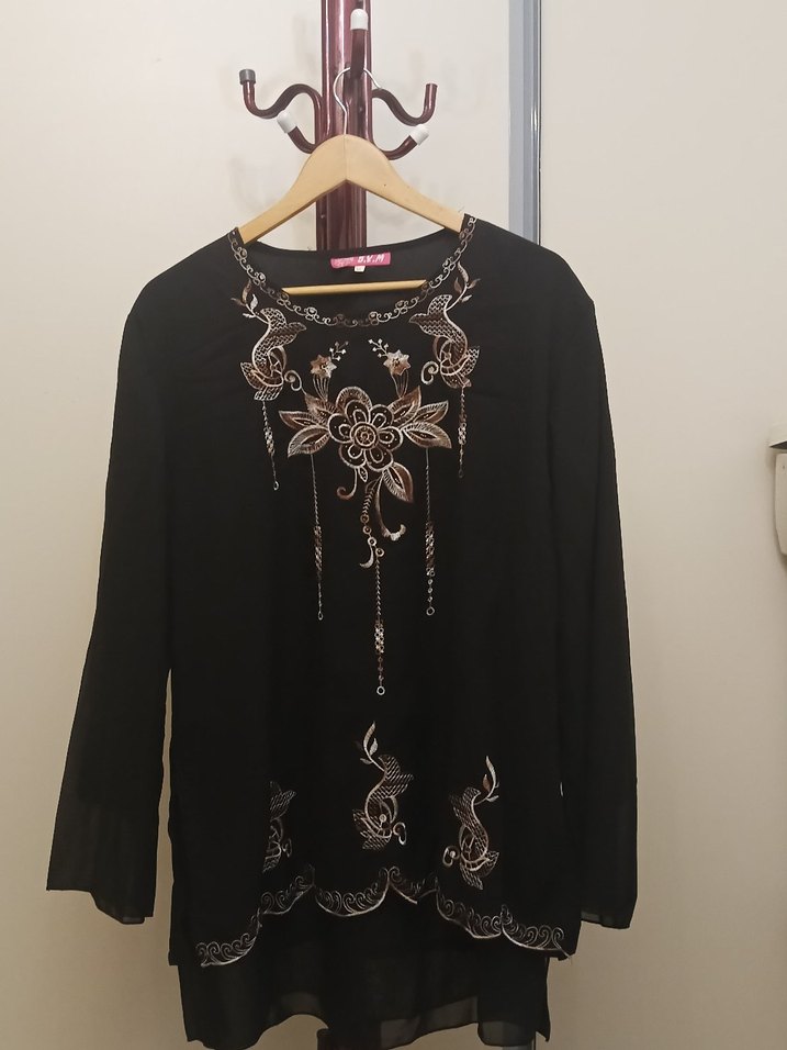Siyah, uzun kollu, bol kesim bluz, ipek gibi kumaş ve nakışlı, boncuklu detaylara sahip, romantik akşamlar için ideal.