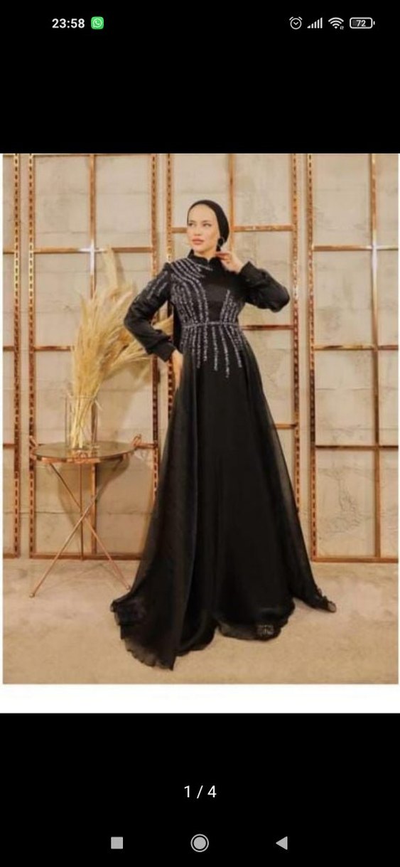 Siyah uzun kollu, yüksek yakalı ve nakışlı detaylara sahip modest kesim, drapeli abiye elbise. Düğünler için uygundur.