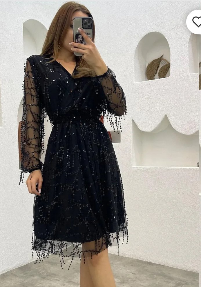 Nakışlı detaylara sahip siyah, uzun kollu, drapeli V yakalı elbise. Gevşek kesimiyle gotik parti tarzına uygun.Diz altı boyda ve çok şık duruyor,fazlalıkları gizliyor
