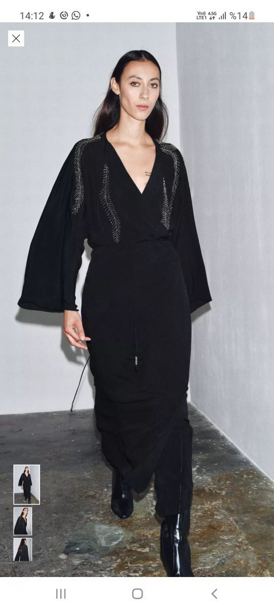 Siyah renkli, uzun kollu, V yaka, bol kesim ve drapeli kadın elbisesi. İpek gibi kumaştan olup nakışlı detaylara sahiptir. Gotik, avangart tarzda günlük kullanıma uygundur. #zara xs, s beden uyumludur