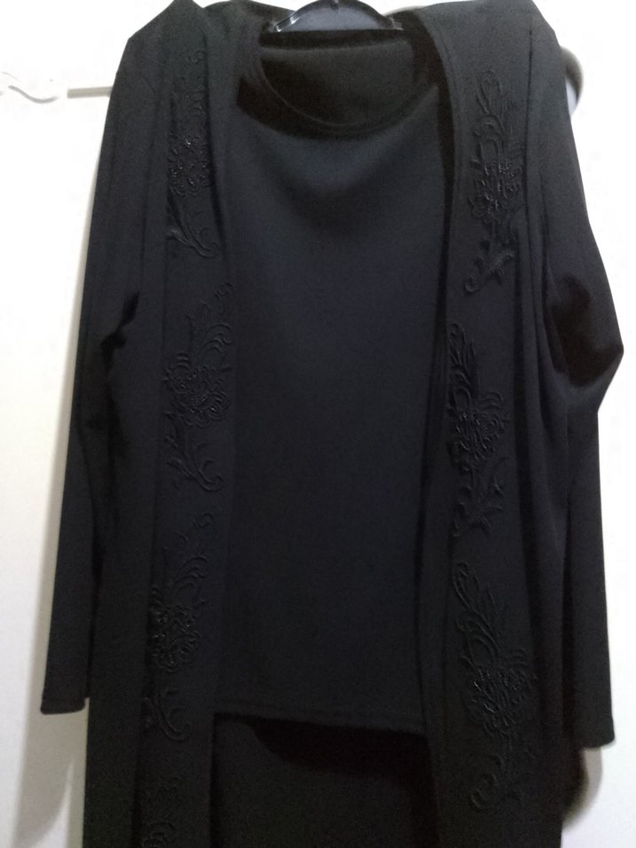 Siyah, uzun kollu, vücuda oturan kadın Hırka ve bluz nakış detaylarına sahiptir. Uzun boyuyla karanlık ve şık bir görünüm sunar. renk de solma yok sadece özel günlerde giyilmiş