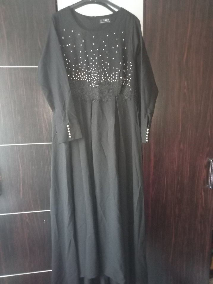Uzun Kollu Siyah Nakışlı önü kısa arkası Uzun Elbise