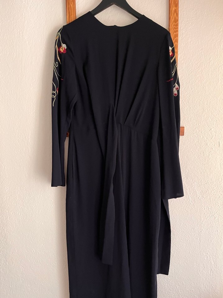 Uzun kollu, yakası çentikli siyah elbise, kollarında nakış detayları bulunur. İpeksi kumaşıyla rahat ve dökümlü, bohem ve Paris tarzı bir görünüm sunar.