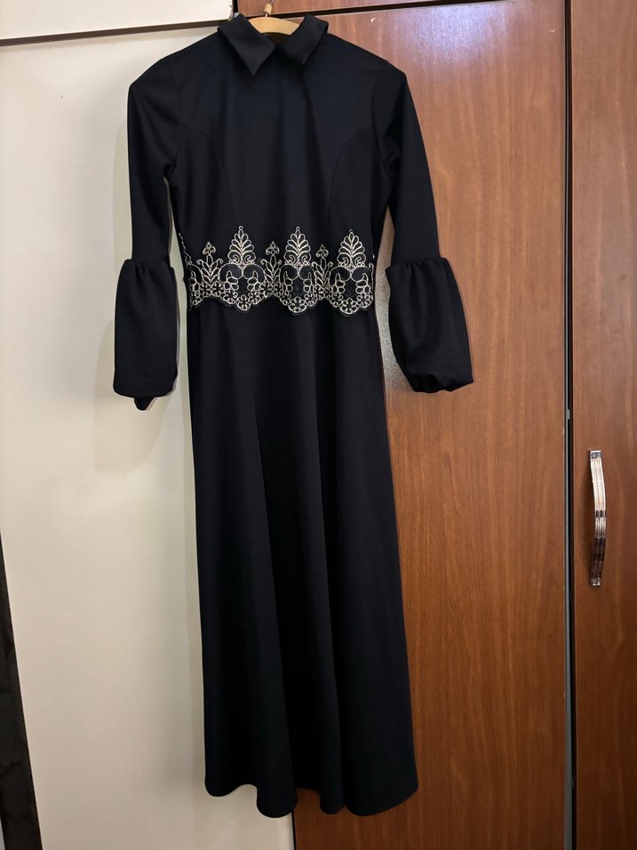 Uzun Kollu Siyah Nakışlı Uzun Elbise tesettür