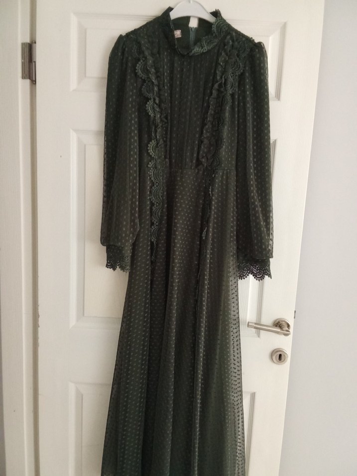Yüksek yakalı, fırfırlı ve nakışlı desenlere sahip uzun haki renkte elbise. Bol kesim ve uzun kollu, ofis için uygun vintage gotik tarzda.