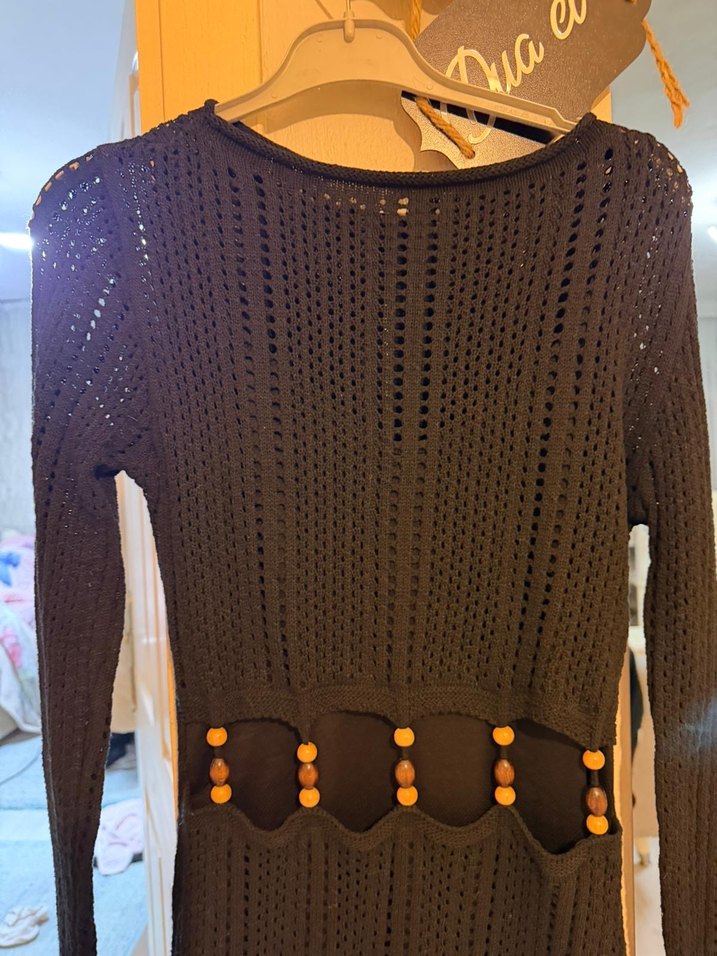 Bu siyah, uzun kollu, fitted örgü kazak bohem tarzı desenli ve bel kısmında ahşap boncuk detaylıdır.
