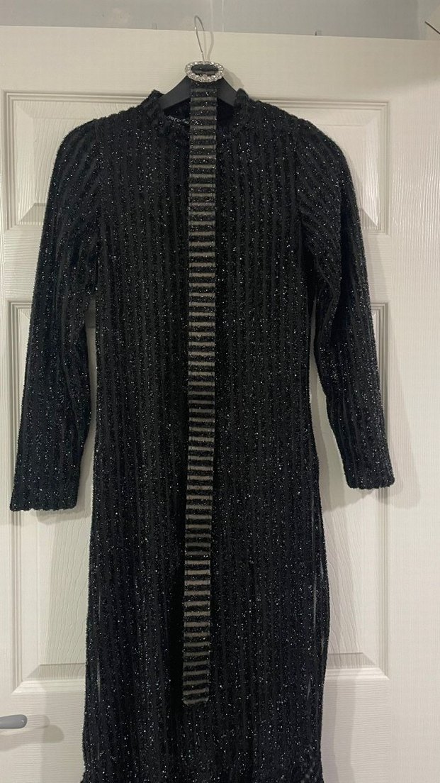 Uzun kollu, vücuda oturan siyah örme elbise, pile detaylı ve yaka kısmı kesik yakalıdır. Gotik tarzda, romantik akşamlar için uygundur.