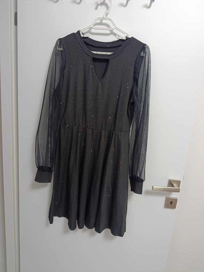 Siyah uzun kollu, V yakalı, bol kesim gotik elbise, ince parıltılı detaylarla dikkat çekiyor. ✨