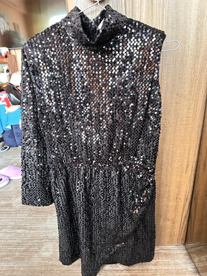 Uzun kollu, yüksek yakalı ve payetlerle işlenmiş siyah, sırt detay vücuda oturan abiye elbise, göz alıcı parti şıklığı sunar. ✨